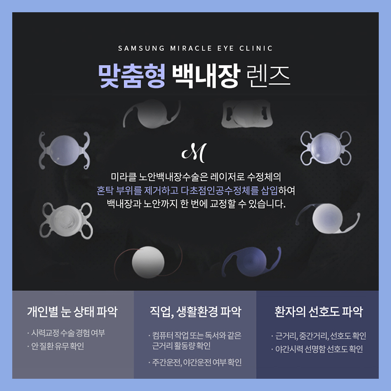 한번 삽입된 렌즈는 특별한 상황이 아니면 빼지 않고 평생 사용하기 때문에 상담 시 일상과 취미 등을 충분히 상담해야 가장 이상적인 시력을 얻을 수 있었습니다.