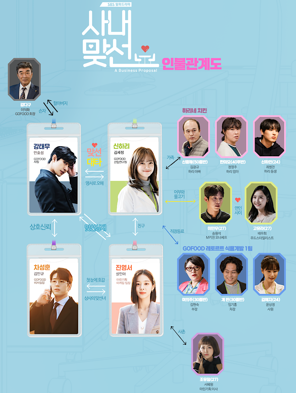 그럼 홈페이지에 공개된 사내 맞선 인물 관계도를 보자. 주요 인사가 4명 보인다. 강템, 신하리, 차성훈, 진영서. 주연배우로는 안효섭 김세종 김민규 설인아. 태무와 영서 관계는 말 그대로 대립한 상대. 그런데 대타로 탄력이 들어가는데 과연 어떻게 흘러갈지 관계가 주목된다. 주변에 하리네치킨 사람들 고푸드 레토르트 식품개발 1팀 그 밖에 고푸드 회장까지 다양한 주변 인물들을 볼 수 있다.