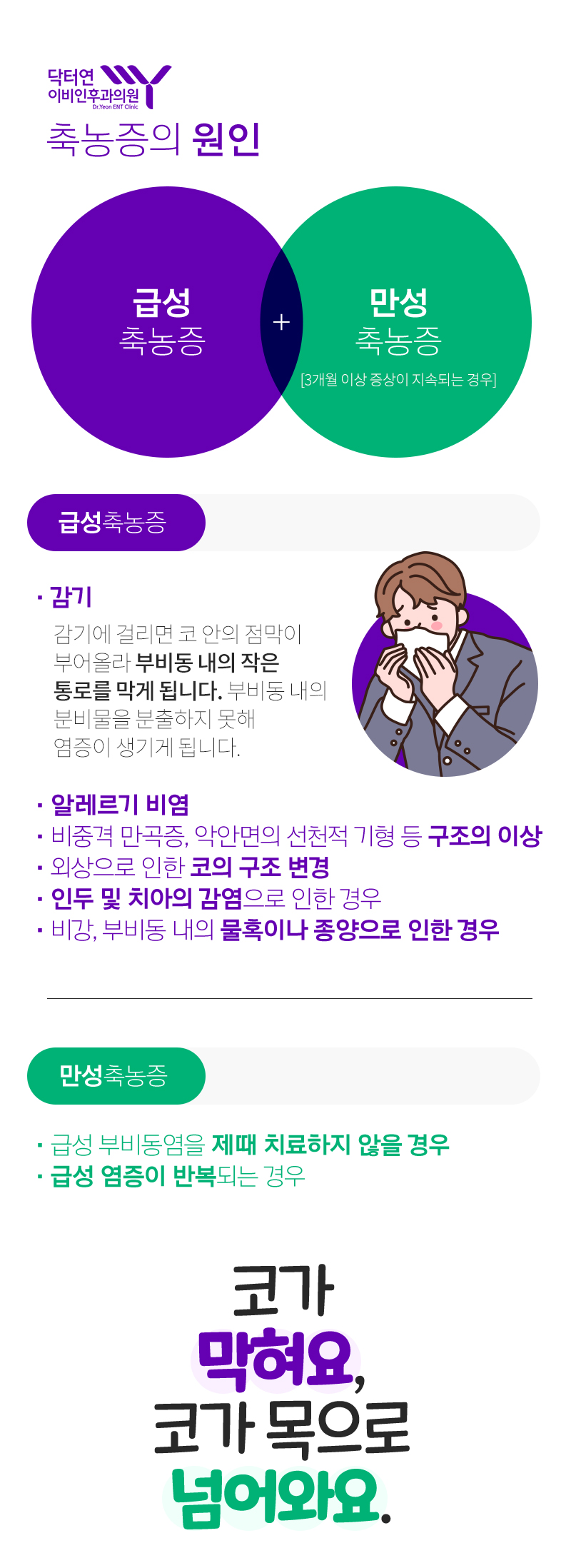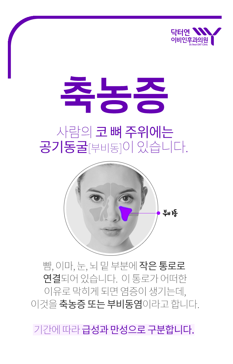 #축농증은 흔한 코 질환 중 하나인데 콧속의 공간인 부비강에 염증이 생겨 발생합니다. 많은 부비강 환기 및 분비물 배출 기능에 문제가 생겨 염증이 발생하여 나타납니다. 코막힘, 콧물, 재채기 등이 나와요. 이러한 증상이 4주 이내라면 급성 축농증, 3개월 이상이면 만성 축농증으로 구분됩니다. 축농증은 단순한 감기나 일시적인 증상으로 치부해 버려, 증상을 악화시키는 경우가 많습니다만. 만성화되면 호흡문제를 일으켜 안면통증, 두통, 후각장애, 수면장애 등을 일으켜 삶의 질이 저하될 수 있습니다.