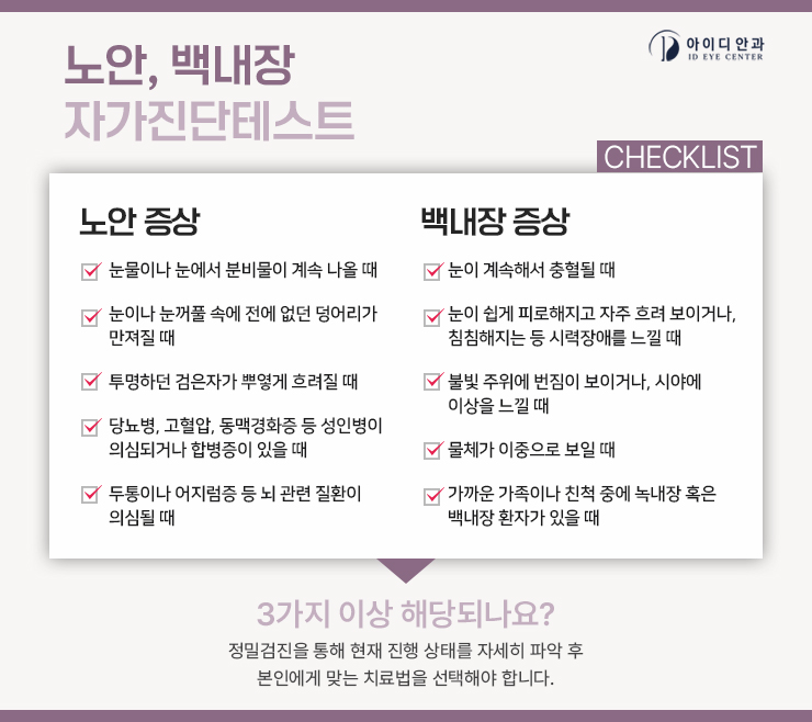 나이가 들어 노화가 찾아오면 다양한 질환이 발생합니다.그 중 노안은 주로 4~50대 연령층에서 흔히 나타나는 안질환입니다.노화현상은 나이가 들면서 발생하는 자연스러운 것이지만 노안과 발생시기가 비슷한 백내장은 오랫동안 방치할 경우 실명으로 이어지는 질환이므로 안과를 방문하여 정기검진을 받고 적극적으로 관리해야 합니다.