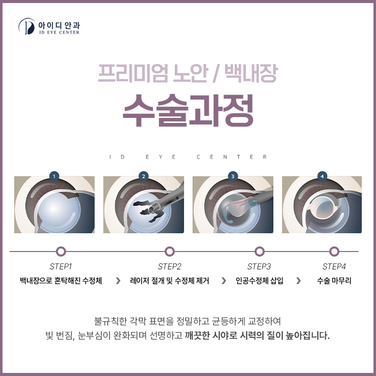 백내장을 개선하기 위해서는 혼탁한 수정체를 제거하고 다초점 렌즈 삽입술을 시행해야 합니다.저희 병원은 이 과정에서 레이저 장비인 펨토LDVZ8과 수정체 유약 장비인 센츄리온을 활용하고 있습니다.