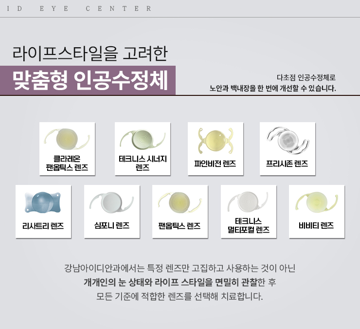 이처럼 각기 다른 특징과 단점을 가지고 있기 때문에 자신의 생활 패턴, 눈 상태에 적합한 렌즈를 선택함으로써 보다 선명하게 시력을 개선할 수 있습니다.