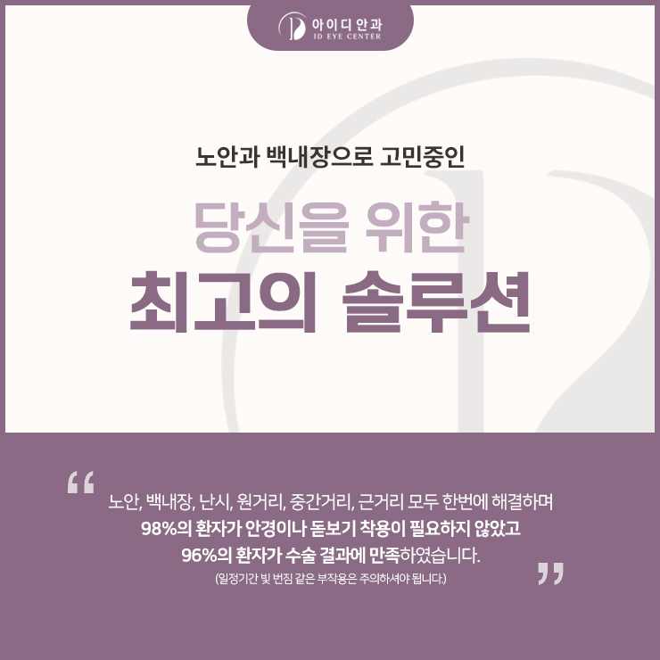 저희 병원은 풍부한 노하우와 경력을 쌓은 안과전문의가 1:1 맞춤진료를 진행하고 있으며 첨단 검안장비와 수술장비를 보유하고 있어 보다 안전하게 진행할 수 있으며 정밀검사 결과를 바탕으로 정확하게 진단하고 있습니다.시력저하의 문제가 생겨 일상생활에 많은 불편을 느끼셨다면 가능한 빠른 시일 내에 눈 상태를 확인하신 후 수술 계획을 세우시기 바랍니다.