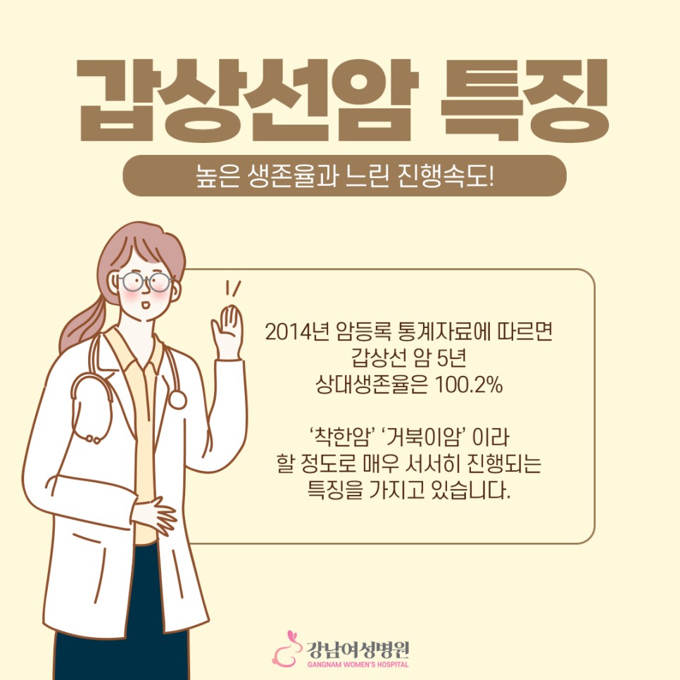 갑상선암의 가장 큰 특징이라면 느린 진행 속도, 높은 생존율입니다 이 때문에 착한 암, 거북이 암이라고 불립니다. 하지만 갑상선암도 몇 가지 종류로 나뉘기 때문에 모두 같은 성격은 아닙니다.