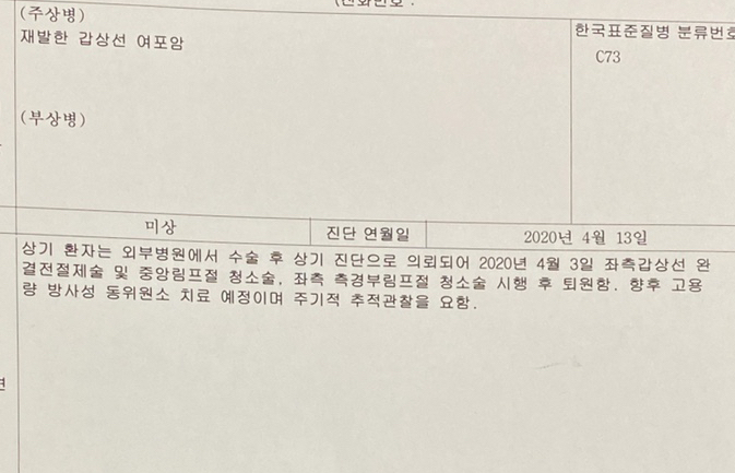 여포암 후기는 너무 없을 뿐 아니라 재발 전이 기록은 더 없어 정말 답답했다.지금은 검색을 멈추고 2somsom.blog.me 1, 2개월 안에 일어난 재발 기록을 간단하게 기록해둔 포스팅.갑상선암 환자 중 여포암은 5% 정도로 드물기 때문에 정보가 많지 않아 정말 어려웠던 시간. 다만 수수방관하고 병원만 믿고 가기에는 또 이런 결과가 나올까 두려웠다.극소수이지만 여포암 환자들을 알고 현장 의료인분들의 도움을 받으면서 교수님께 듣는 말은 제한적이고 진단서에도 쉽게 나와있지만 전이가 잘되는 이 암을 항상 의심하고 주변 사례를 듣고 치료 공유하는 것이 환자의 자세라고 알려주시고 그래서 저도 지금은 몸관리하면서.. 할 수 있는 일을 하고 더 열심히 공부해서 전투적으로 치료하기로 결심합니다.의무기록 사본, 각종 결과지는 항상 챙겨오는 것이 습관이다.
