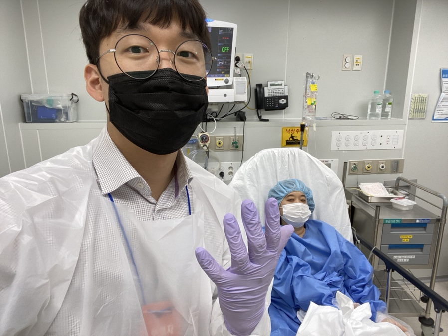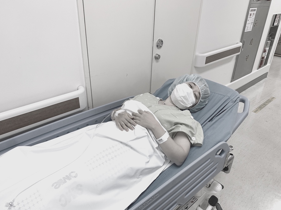 갈아입자마자 수술 침대가 와서 엉덩이 주사 세게 맞고(ㅠㅠ) 수술 침대에 누웠다.머리에 쓴 게 웃겨서 남편과 장난치며 아무렇지도 않게 웃으며 정말 출발.