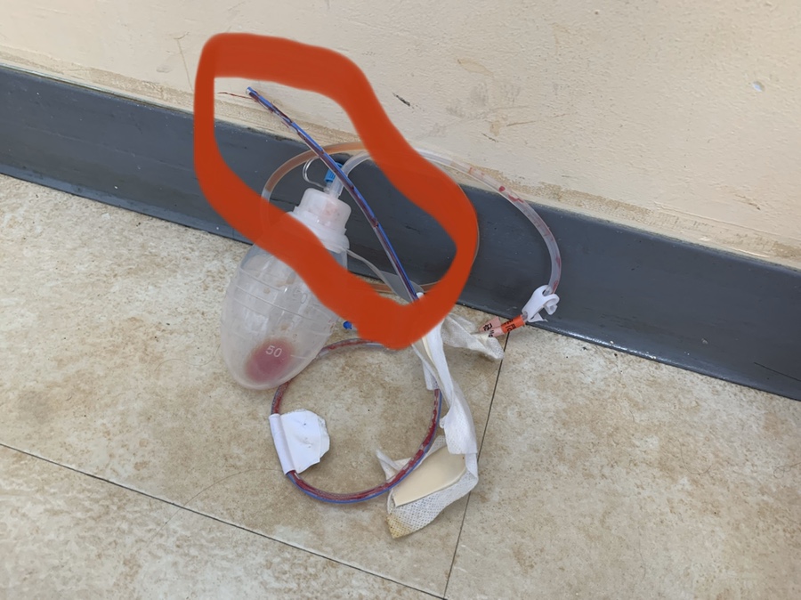 그리고 퇴원 전. 드디어 피봉투(배액관)를 뽑았다. 남편이 가족 방에 올려놓고 내려받은 사진. 빨간 표시만큼 목 안에 들어 있었다.가죽주머니를 뽑을 때. 작은 매로 휙 찢어서 쓱! 뽑았는데 느낌 정말…. 최악. 매로 찢어서 뭘하고, 아파서 의사의 팔을 잡아버린다.아무튼 이제 정말 끝!!!