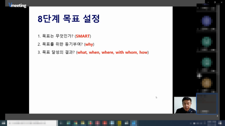 NLP에서 정의하는 목표는 일반적인 목표와는 다릅니다. 목표(outcome)란 무엇이고 메타웃컴(meta-outcome)이란 무엇인지에 대한 개념을 확립한 후에 지금까지 배운 모든 NLP기법을 활용해서 8단계에서 목표를 설정하는 방법을 실습합니다.