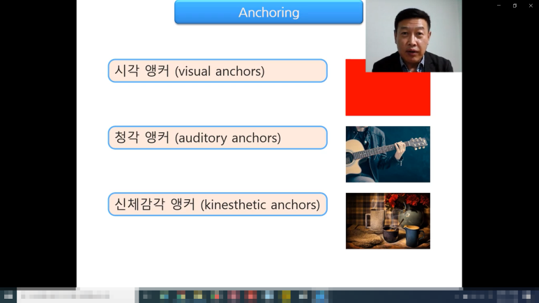 ▶ 9교시 1월 22일(금) 20:00 ~ 21:30 강의주제 : NLP기법 실습 – 앵커링(Anchoring) 체이닝(Chaining) 기법