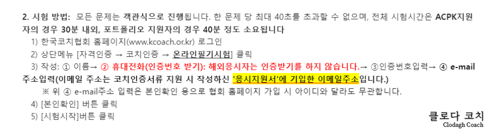 - * 해외수험자 KPC 실기시험 응시방법 한국코치협회로부터 필기시험 합격 후 실기시험 응시시간과 함께 해외수험 전화 접속방법 안내 이메일을 보내주셨습니다.해외 전화 사용자의 전화번호가 따로 있어서 저는 해외에서 안내받은 번호로 텔레 접속했습니다.