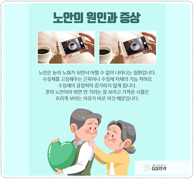 눈 건강의 경우는 대체로 시력이 떨어지는 것 이외에는 특별한 증상이 발견되지 않는 것이 대부분입니다. 컨디션이 안좋거나 또는 눈을 많이 쓰게 되는 날에는 침침하게 느낄 수도 있는데 이때 충분한 휴식과 숙면을 취하는데도 이런 증상이 개선되지 않는다면 눈의 노화가 시작될 수도 있을 것 같습니다.