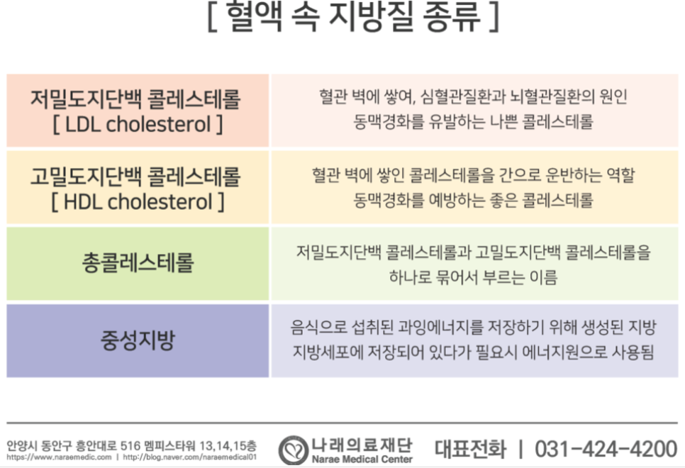 고지혈증 혈액 속의 지방질은 HDL 콜레스테롤, LDL 콜레스테롤, 중성 지방으로 나눌 수 있습니다.