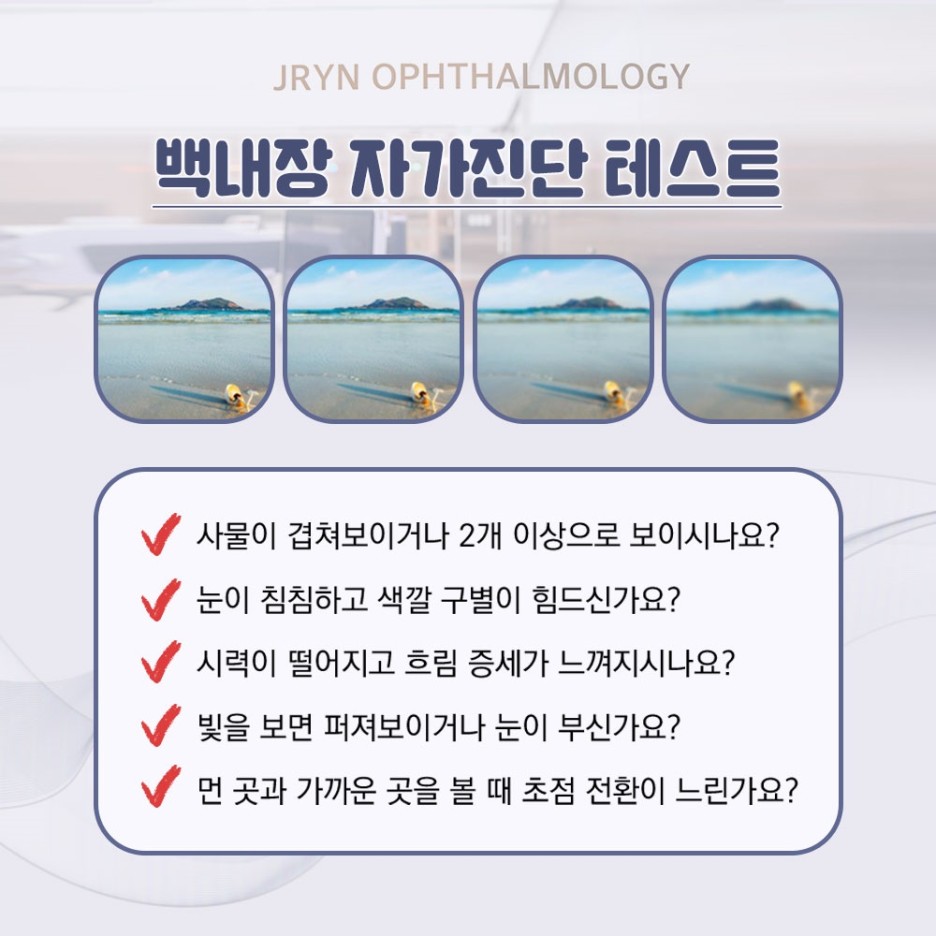 사물이 겹쳐 보이거나 둘 이상으로 보이는 복시 증상이 나타나 색깔 구별이 어렵고 빛을 보면 번지거나 눈부심을 느끼게 됩니다. 밝은 곳보다 어두운 곳에 있을 때 시력이 향상되고 검은 눈동자가 하얗게 됩니다. 이런 증상을 방치하면 급격히 시력이 나빠져 결국 실명에 이르게 됩니다.