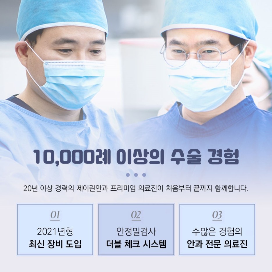 10,000례 이상의 백내장 수술 경험을 바탕으로 안전하고 정밀한 수술을 시행하고 체계적인 사후관리 시스템을 통해 부작용 예방에도 많은 노력을 기울이고 있습니다.