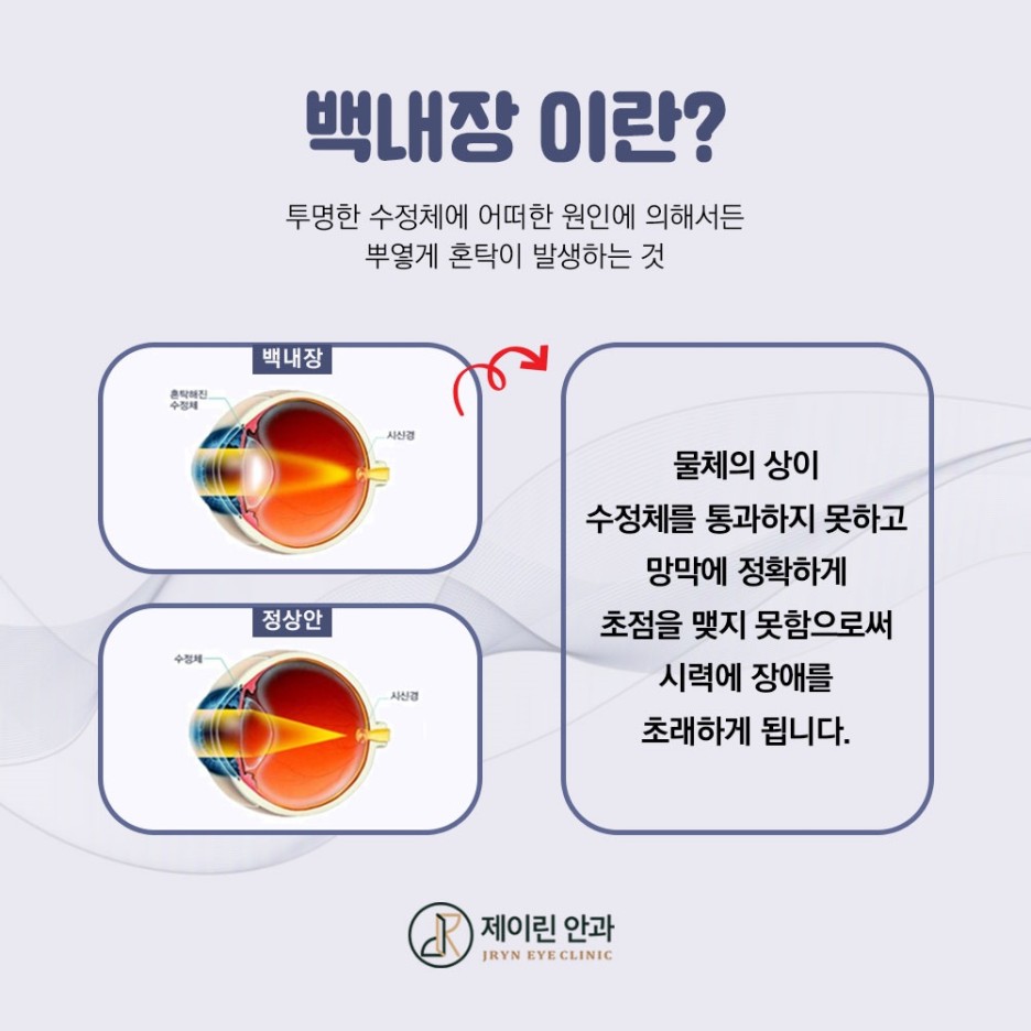 백내장은 수정체가 투명성을 잃고 혼탁해지는 질환으로 물체의 상이 수정체를 통과하지 못해 망막에 정확히 초점을 맞추지 못해 마치 안개가 낀 것처럼 시야가 흐릿해지고 흐릿하게 변하는 현상입니다.