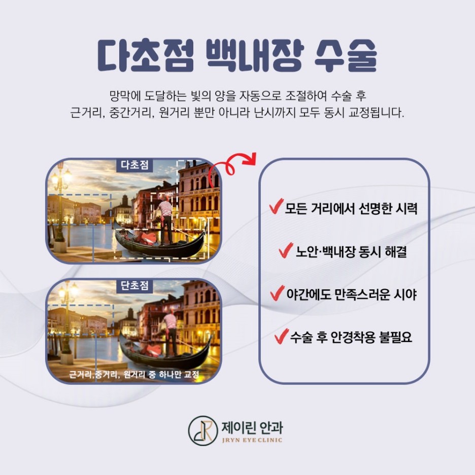 다초점렌즈는 백내장과 노안을 동시에 교정하는 특수 인공수정체로 망막에 도달하는 빛의 양을 자동으로 조절하여 수술 후 근거리, 중간거리, 원거리뿐만 아니라 난시까지 모두 개선할 수 있으며 교정도구로부터 해방되어 편리한 일상생활을 가능하게 합니다.