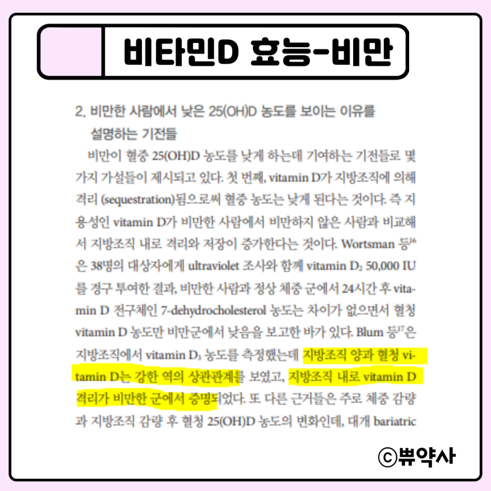 비만하면 혈중 비타민D 수치 감소 비만이면 비타민D의 혈중 농도가 정상 체중인 분에 비해 낮게 나온다고 합니다.