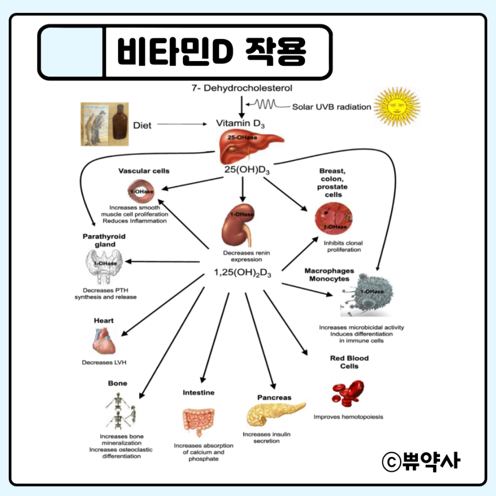 비타민D는 호르몬은 아니지만 호르몬처럼 모든 장기, 조직에 작용하여 생리활성을 돕습니다.