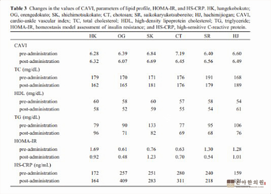 이 연구에서는 본아한의원과 마찬가지로 고혈압 한약재를 관리하여 반하후박탕, 칠물강하탕 등을 사용하였습니다.