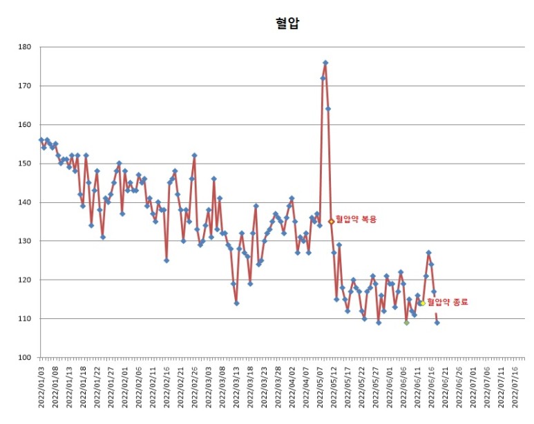 그러다가 5월 초중순경 무슨 이유인지 모르고 (아마 술 때문인 것 같아) 연 3일 동안 170 이상이 계속됐고, 나는 황급히 내과에 가서 진단을 받은 뒤 생애 처음으로 한 달간 고혈압 약을 처방받았다.
