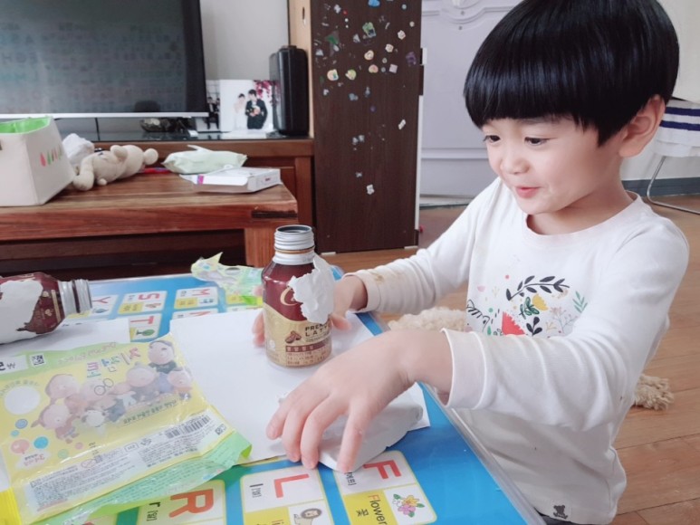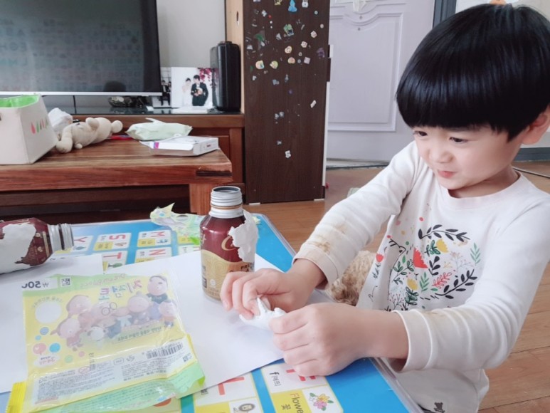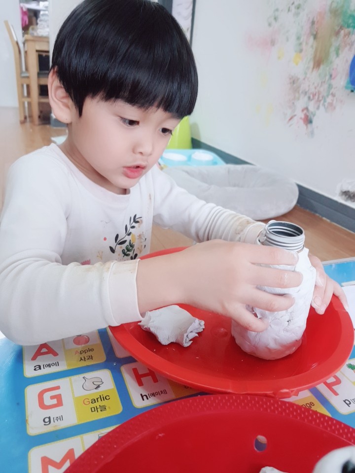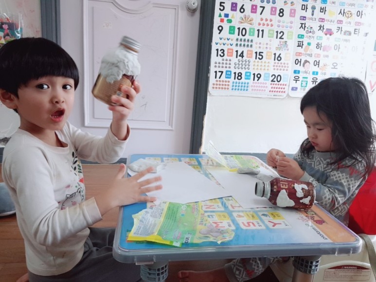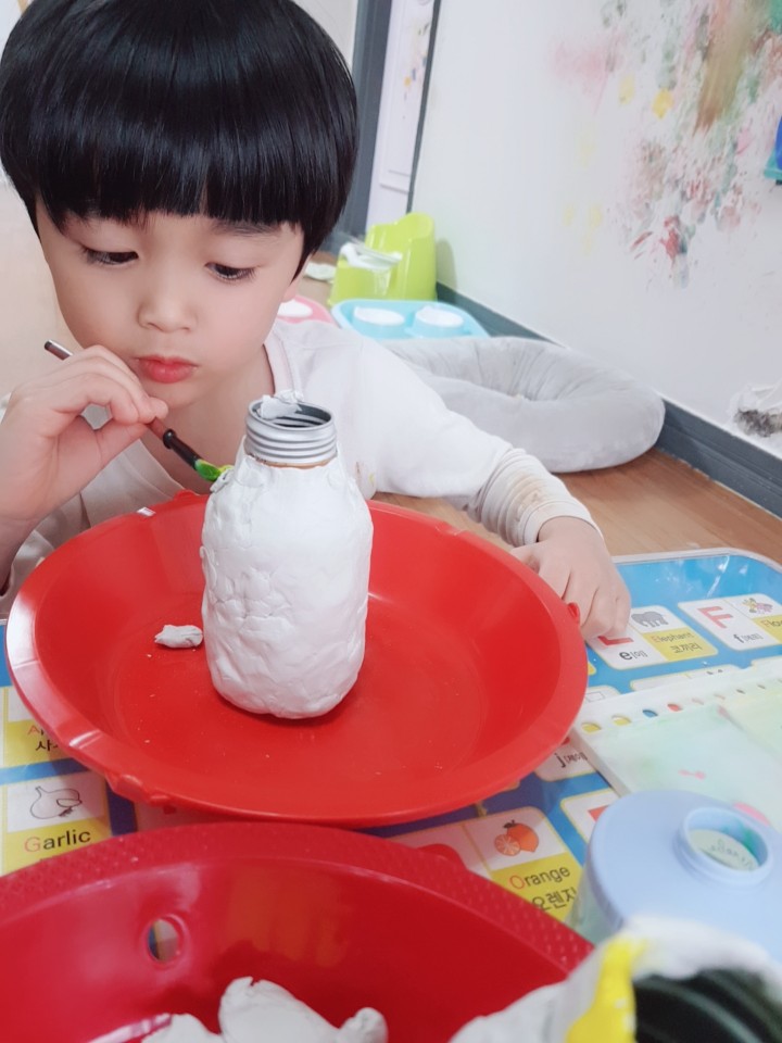 우선 집에서 다 마셔놓은 커피병을 하나씩 건네주고는 마음대로 종이점토를 붙일 수 있게 했다.