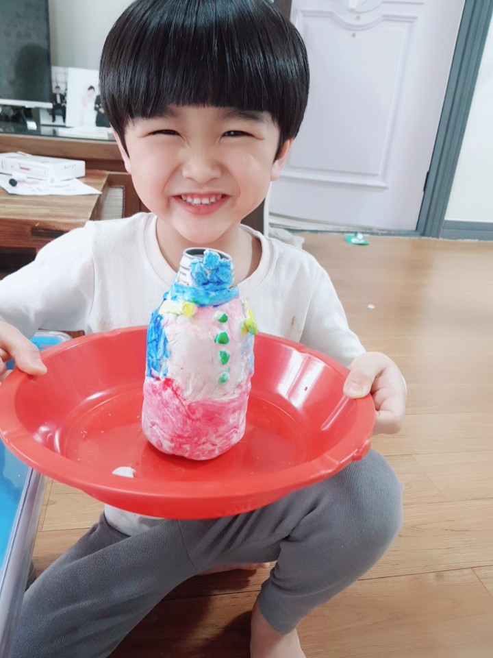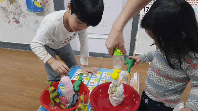코로나 때문에 집에 틀어박혀 있던 2020년 따뜻해진 봄날, 지니오니와 주니어네이버에서 공룡 멸종송을 듣고 나름대로 집에서 엄마 과학놀이를 하기로 했다.공룡이 사라졌대~ 화산폭발설! 소지품 : 종이점토, 음료수병, 물감, 베이킹소다, 식초