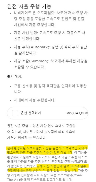 한국에서는 한글로 번역한 다른 용어를 사용하지만 독일과 같은 국가에서는 사람들이 오해할 수 있는 충분한 단어이긴 합니다. 음, 단어가 문제가 될 수 있지만 구매자 입장에서 사용되는 단어에 따라 그 기능에 대해 이해하는 것이 달라질 수 있기 때문입니다. 특히 Tesla의 경우는 자동차 판매를 영업점을 통해 이뤄지는 것이 아니라 홈페이지에서 진행되기 때문에 홈페이지에 표현된 용어는 그 기능을 대표하는 것으로 이해할 가능성이 높습니다. 현재 한국의 Tesla 홈페이지에서도 Autopilot을 설명하면서 완전 자율주행이라는 표현을 사용하고 있습니다. 물론 작은 글씨로 아래쪽에 경고문이 있습니다. 옵션선택버튼아래에요. 경고문에는 완전 자율주행이 가능한 것은 아닙니다라는 표현이 있습니다. 위에는더큰글씨로완전자율주행기능이라고적어있습니다. 구매자 입장에서는 아래 작은 글씨까지 읽을지는 의문입니다.
