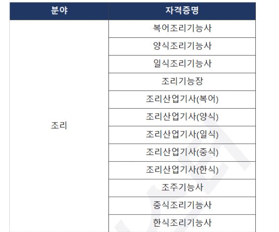 복어조리기능사, 양식조리기능사, 일식조리기능사 등 조리의 종류별로 자격이 많이 있으니 참고해주세요.
