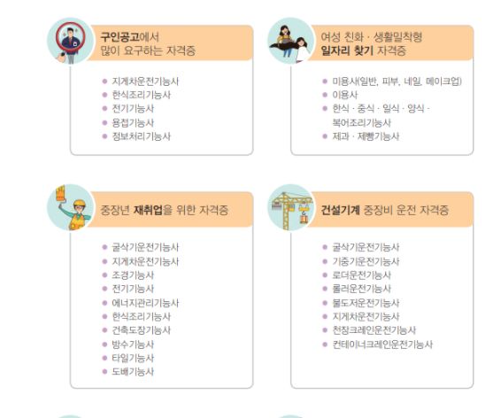 중장년층들의 재취업에 유리한 자격증부터 여성친화자격증까지 각자의 상황에 맞는 다양한 자격증 종류를 정리해 주셨습니다.