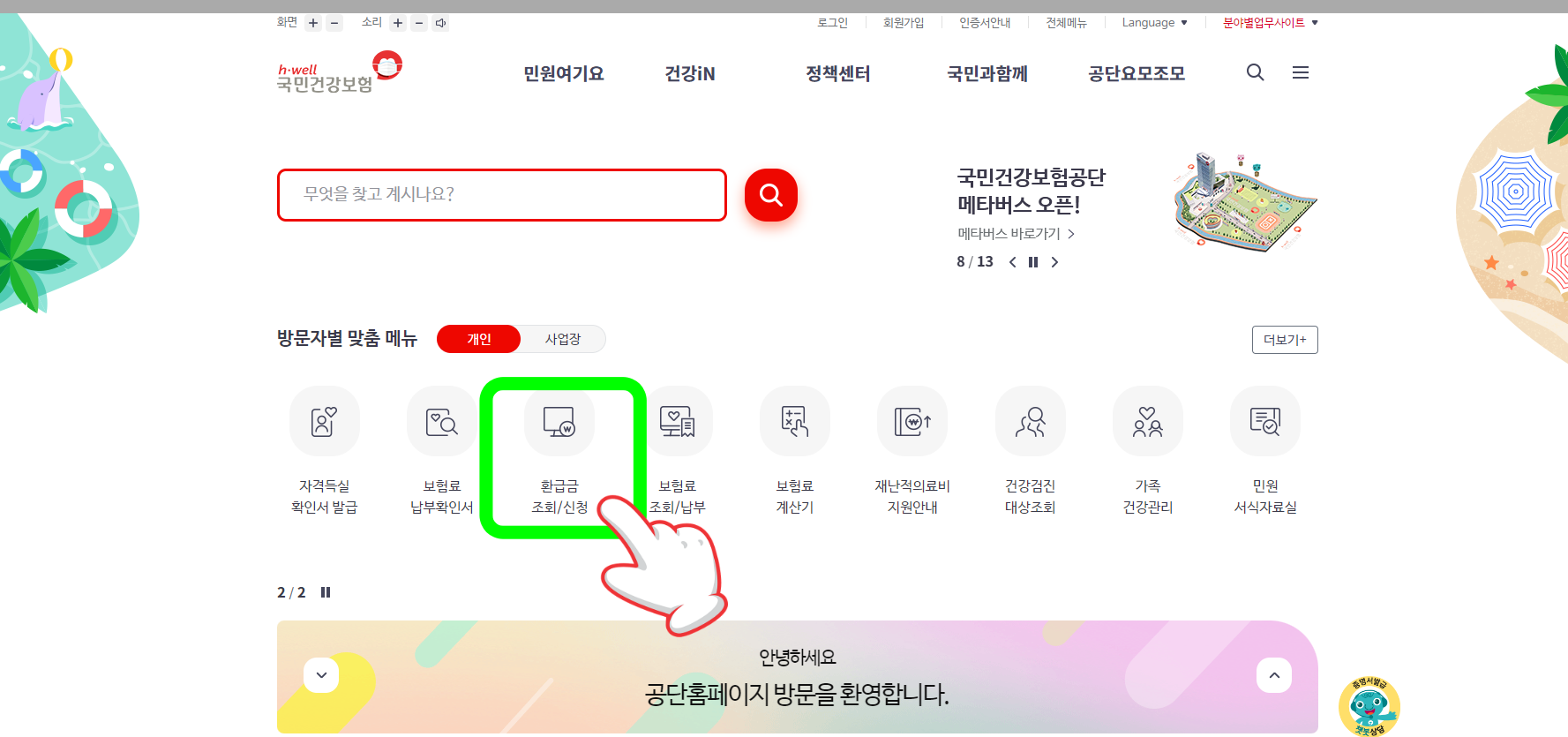 해당 페이지에 들어가셔서 통합민원서비스를 클릭하시면 개인민원으로 들어갑니다.이후 ‘보험급여 내역 및 진료받은 내용’ 버튼이 보이는 텐테를 클릭하여 [본인부담금 환급금 신청]에 들어가 간단한 인증 후 자신이 받을 수 있는 환급금이 있는지 조회할 수 있습니다. 해당 사항이 없으신 분들은 어쩔 수 없지만 해당 사항이 있으신 분들은 바로 하단의 신청 버튼을 눌러 환불받을 계좌를 입력하시고 받으시면 됩니다.해당 사이트에 가서 조회하려면 아래를 참조하십시오.