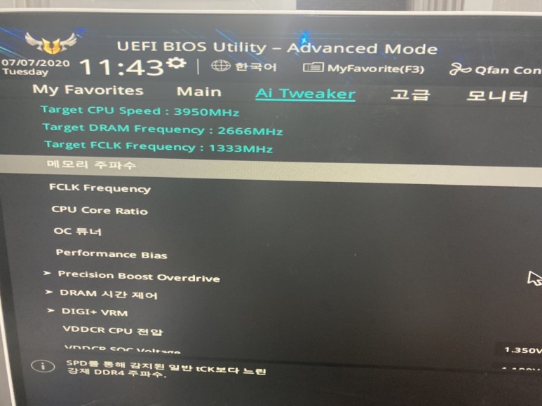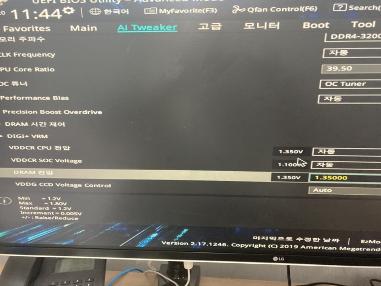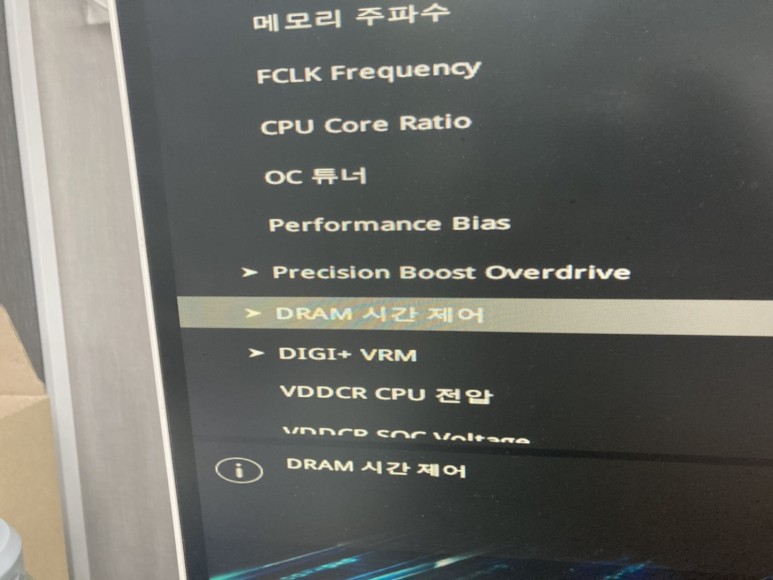 D램 전압을 1.35로 전환합니다. 이걸로 램오버는 다 끝납니다 가끔 DRAM 전압을 변경할 수 없는 메인보드가 있지만 대부분 저렴한 보드이기 때문에 안타깝게도 램 오버클럭은 불가능하다고 할 수 있습니다.ㅠㅠ이번에는 PBO 부스터의 활성화에 대해 알아보도록 하겠습니다