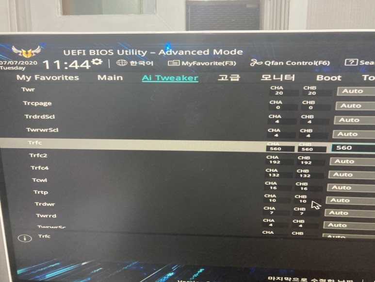 그럼 이렇게 D램 타이밍을 조절할 수 있지만 3200 무조건 성공하는 기본값입니다. 좀 더 타이트하게 조이면 좋겠지만, 이것만으로도 성능은 항상 10% 이상이 되므로 이 정도로 하는 것이 좋습니다.DRAM CAS # Latency 16Trcdrd 18Trcdwr 18DRAM RAS #PRE Time 18DRAM RAS #ACT Time 42Trc 65로 상위 6개의 값을 변경합니다. 거기서 더 아래로 내려갈 거예요.