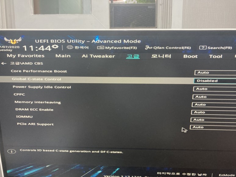 그 다음에 중간에 Global C-sta teControl 옵션을 disabled로 변경을 해서 끄시면 되겠습니다. 해당 옵션은 전원 옵션인데, pbo가 활성화되면 전력이 적어지면서 pbo 부스터가 적게 들어갈 수도 있기 때문에 꺼지는 옵션입니다.
