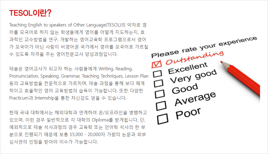 테솔(TESOL)은 활용도가 높아 영어 교육 및 영어 관련 업무를 선호하는 분들에게 많은 도움을 받고 있어 많은 분들이 관심을 가지고 있습니다. ^^ * 테솔의 자격증을 더 자세히 알고 싶다면 붉은깻잎(단기 테솔 6주 Diploma) 과정을 통해 상담해보세요.