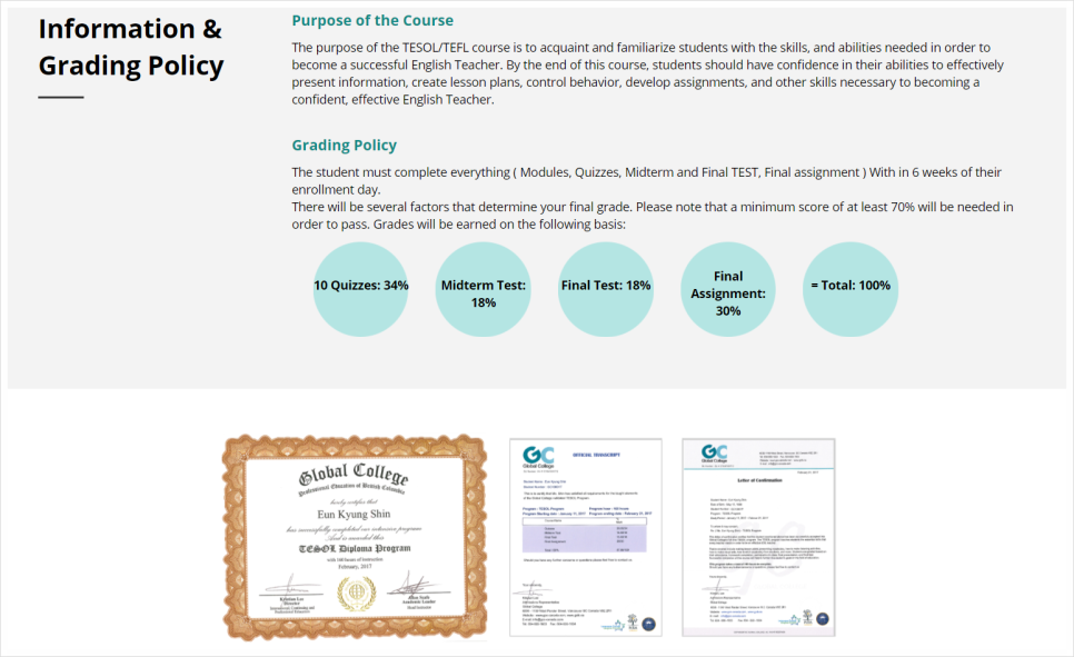 마지막으로 캐나다 단기 테솔(TESOL) 과정은 한국에서 유일하게 캐나다 대학교 Glenn College의 테솔 Diploma를 온라인으로 취득할 수 있는 교육기관입니다.