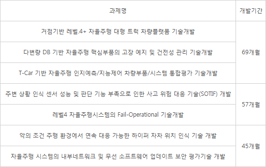 <표> 자율주행기술개발 혁신사업 신규지원 대상과제