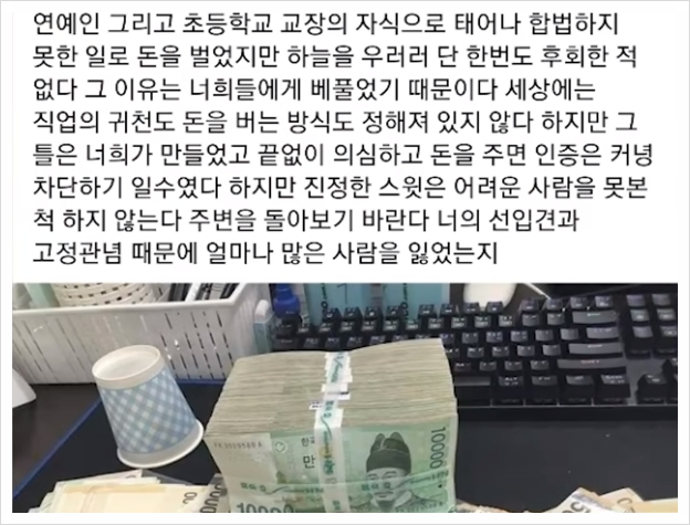 김재영은 현금 다발을 인증해 자신의 부유함을 과시했고 이곳에 요양원과 자원봉사자 사진, 도움을 받은 사람들의 인증 사진을 올려 본인은 나눔을 실천하는 사람이라는 이미지를 만들어 갔습니다.