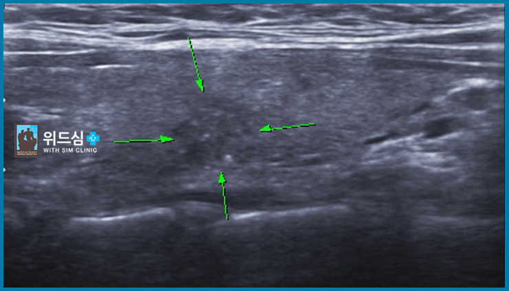 김포 갑상선 초음파 검사로 조기 진단!40세 여성 환자가 내원했어요. 국가검진 시 함께 처음 시행한 갑상선 초음파 검사에서 갑상선 경계가 불분명한 미세석회화를 동반한 저음영병변이 있었고, 안타깝게도 형태가 바뀌어 전이 의심되는 경부 림프선 부종이 보였습니다.