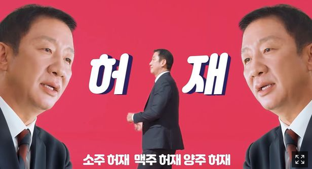 광고 포스터에는 양복을 입은 허재 씨의 이미지와 함께 아직도 숙취로 고생하고 있네. 이제 허재라는 말이 적혀 있어요. 온라인 광고 영상에서는 ‘소주호재, 맥주호재, 양주호재’라는 자막이 등장하는데 마치 술을 권하는 듯한 느낌이 듭니다.