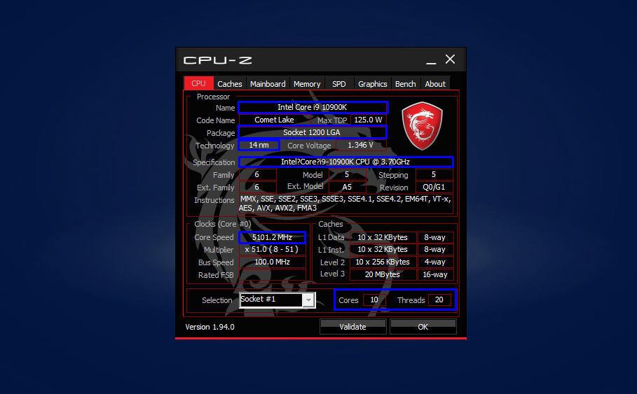 첫 번째 [CPU] 탭이 메인 화면이다. 여기에서는 프로세서 정보를 확인할 수 있다. Name은 모델명이다. 여기까지 알고 있어도 충분하다. 하지만 프로그램에서 제공하는 정보를 보다 자세히 알고 싶은 분이 있을까 싶어 추가적으로 설명한다. “Package”는 메인보드를 교환할 때 필요한 정보이다. 인텔은 통상 2세대씩 소켓타입(ex.LGA1200)을 교환한다. 따라서 기존에 사용하던 CPU를 재활용하고 MB를 새로 구입할 때 무작정 최신 버전을 구입하다가는 무산될 수 있다. 이는 AMD 프로세서에도 해당하는 내용이다.