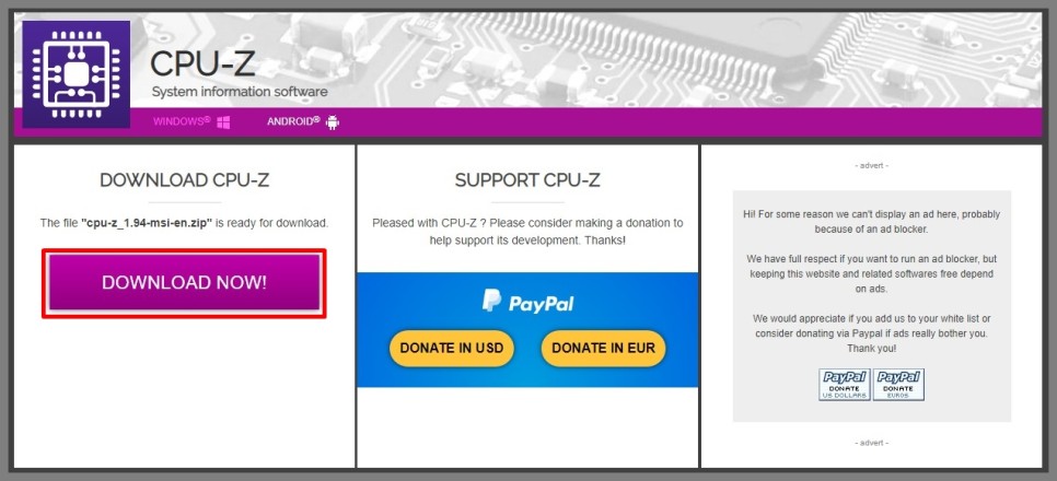 두 번째는 맞춤형 버전이다. 상기 사진과 같이 CPU-Z 다운로드 시 원하는 UI 디자인을 선택할 수 있다. ASUS, MSI, ASROCK, 쿨마, GB 등 각 메인보드 제조사의 로고와 아이덴티 컬러가 적용된 버전을 지원하고 있다. 물론 아무것도 가미되지 않은 클래식 버전도 있다.