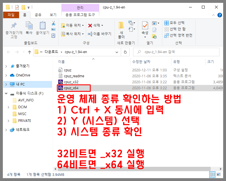 압축을 풀면 총 4개의 파일을 확인할 수 있는데 PC에 설치된 운영체제 아키텍처에 맞는 실행 파일을 더블 클릭하면 된다. 만약 해당 정보를 확인하는 방법을 모르면 위의 사진을 참고하면 된다. 연식이 매우 오래된 시스템이 아닌 이상 대부분 x64일 것이다.