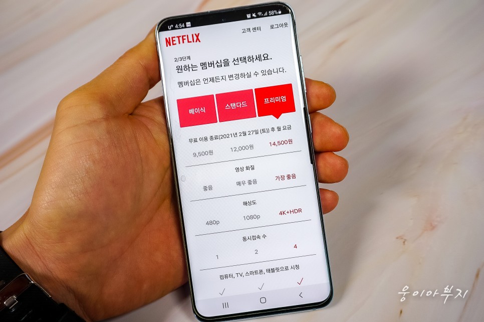 멤버십 종류와 가격입니다. 베이직 / 스탠다드 / 프리미엄 세 가지가 있으며, 각 요금제의 특성은 사진을 참고하시기 바랍니다.