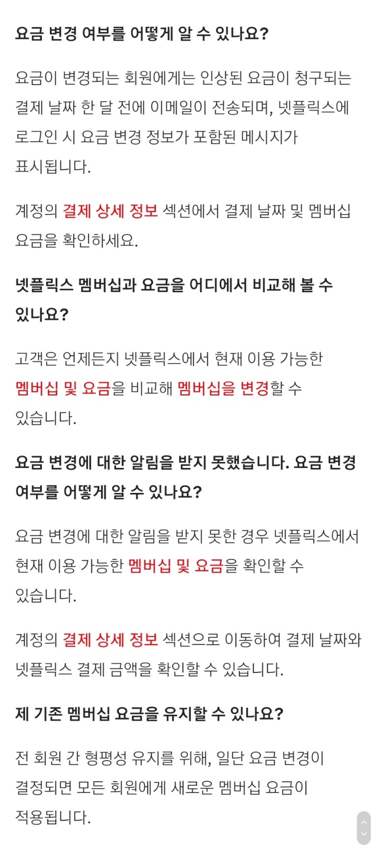 요금 변경 여부를 어떻게 알 수 있죠?요금이 변경되는 회원에게는 인상된 요금이 청구되는 결제일 1개월 전에 이메일이 발송되며 넷플릭스에 로그인하면 요금 변경 정보가 포함된 메시지가 나타납니다.계정 결제 상세 정보 섹션에서 결제 날짜 및 멤버십 요금을 확인하십시오.