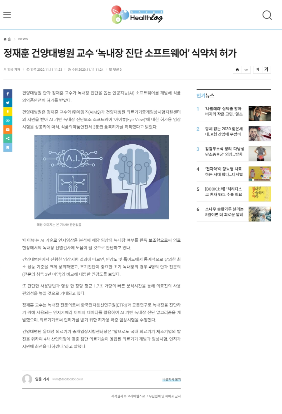 http://www.koreahealthlog.com/news/articleView.html?idxno=30031 건양대병원 안과 정재훈 교수가 녹내장 진단을 돕는 인공지능(AI) 소프트웨어를 개발해 식품의약품안전처의 허가를 받았다.건양대병원은 정재훈 교수와 ㈜에임스(AIMS)가 건양대병원 의료기기 중개 임상시험지원센터… www.koreahealthlog.com