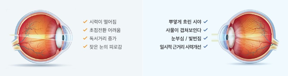 ✅시계가 뿌옇게 흐려 답답함을 자주 느낀다.✅ 물건이 둘로 보인다.✅ 돋보기 안경을 써도 사물이 잘 보이지 않는다.✅눈부심과 근거리 시력이 저하된 인상을 받는다.✅눈이 침침해져 색깔을 구분하기가 힘들어졌다.✅ 가로등을 보면 빛이 퍼져 보인다.