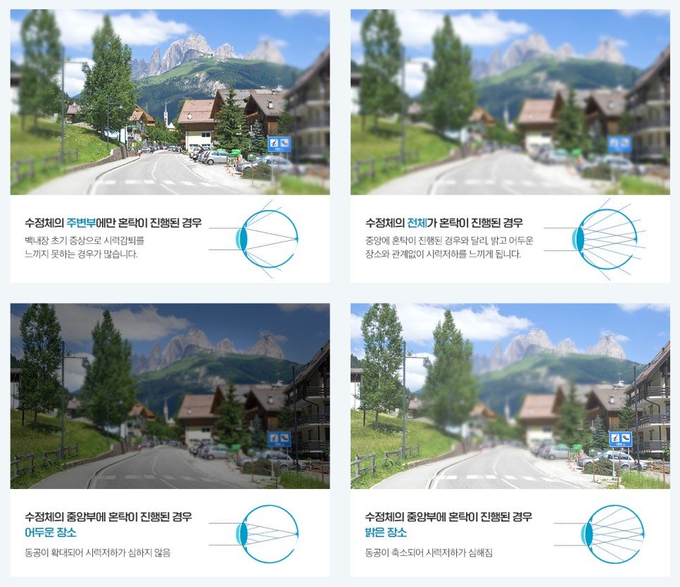 눈부심과 빛이 배이는 어두운 장소에서 밝은 자동차의 빛이나 태양, 조명등의 밝은 빛을 바라보면, 탁해진 수정체를 통과한 빛이 산란해 퍼지거나 눈부신 증상이 나타납니다.