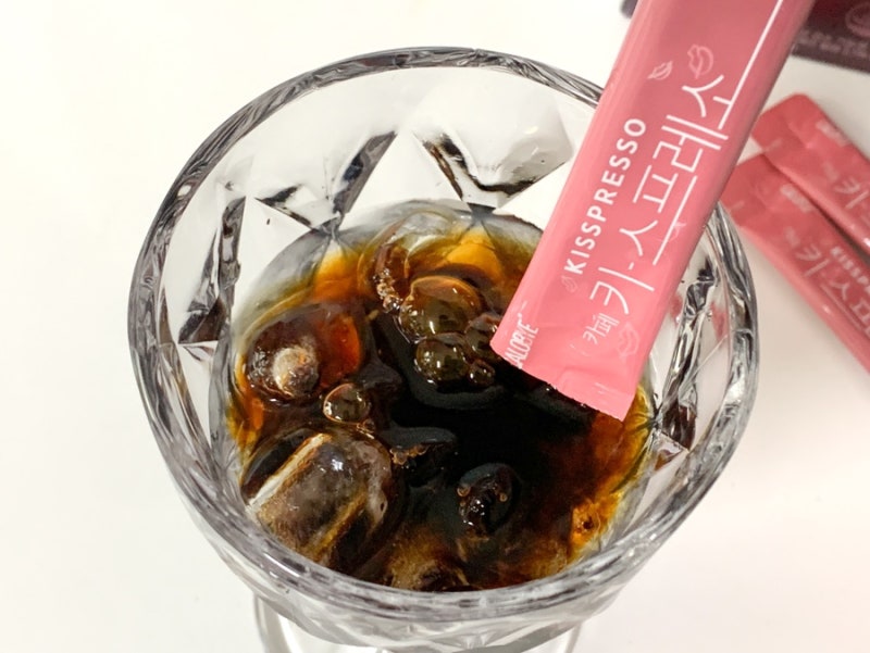 액상을 확인했더니 색깔부터 완전히 진하더라구요. 향도 맡아보니 고소하고 맛있어 보이더라구요. 그다음에 얼음+물 넣은 컵을 가져와서 한 포 녹여봤어요. 정말 차가운 물이라도 빨리 희석되면서 마시기 좋은 음료 한잔이 완성되더라구요~