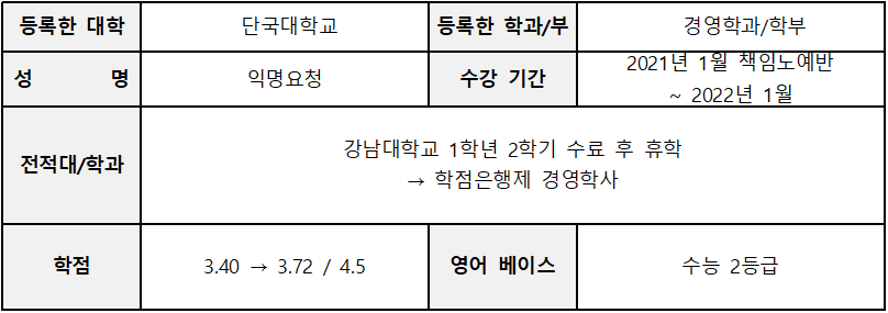 가장 도움이 된 관리 프로그램은?나는 매일, 매주, 매달 테스트를 하는 것이 정말 도움이 되었습니다.매일 아침과 수업 후 단어 시험을 실시하여 해커스 편입 기출보카와 슈퍼보카 어휘를 많이 암기하였습니다.적어도 10번은 읽었을 거예요. 제가 어휘가 약해서 더 열심히 공부한 적도 있지만 학원에서 너무 잘 관리해줘서 피곤하지 않게 공부했어요.7월부터는 일주일에 4번씩 기출 모의고사를 봤는데 이것도 건국대 편입 준비에 많은 도움이 됐어요.학교별 기출을 풀면서 자신의 실력을 평가할 수도 있고, 어떻게 공부해야 하는지 피드백을 주셔서 좋았습니다.가장 기억에 남는 강사진은?저는 박현성 선생님, 정현진 선생님이 특히 기억에 남아요.박현선 선생님은 각 학교별 독해 문제를 정말 꼼꼼하게 풀어줍니다.심화어휘를 모아서 정리해주신 자료도 도움이 되었습니다.정현진 선생님은 문장마다 +, – 체크를 통해 빈칸의 내용을 쉽게 찾을 수 있도록 훈련해 주셨습니다.선생님들이 모두 좋은 자료와 격려의 말을 많이 해주셔서 수업도 재미있고 잘 따른 것 같습니다.과목별 학습 방법은?어휘는 매일 3시간 이상 암기하는 시간을 가졌습니다.편입영단어장은물론선생님들의어휘자료도기본10회읽었습니다.문법은 선생님의 문법 총정리 자료를 통해 꼼꼼하게 암기하고 성분별로 잘라서 문장을 분석하는 습관이 도움이 되었습니다.논리는 문장의 상황에 맞게 긍정, 부정을 판단하는 연습을 하고 논리 노트를 만들어서 모르는 단어가 나올 때마다 정리해 보았습니다.독해는 하루에 많은 글을 읽고 올바르게 해석하는 연습을 계속해 왔습니다.독해 문제는 분석을 제대로 해서 100% 이해하는 것이 중요하다고 생각해요!편준생들에게 한마디!22살에 군대도 안 가고 편입 준비하는 게 옳은 선택인지 의문이 들 때도 정말 많았던 것 같아요.그때마다 어떻게 될지 불안하고 힘들었지만 끝나고 건국대 편입이라는 좋은 결과까지 얻을 수 있어서 후회도 없고 보람도 있습니다.편입에 성공한 만큼 대학에 들어가서 더 열심히 공부하고 준비할 수 있다는 자신감도 생겼어요~ 여러분도 이런 저를 보면서 충분히 할 수 있다는 것을 생각하고 더 열심히 했으면 좋겠습니다.항상 제가 응원할게요!▼ 뭐부터 들어야 할지 모르겠으면 무료 레벨테스트로 딱 맞는 강의를 골라보자! ▼#단국대편입 #단국대편입 #종로편입학원 #편입학원추천 #단국대편입요강