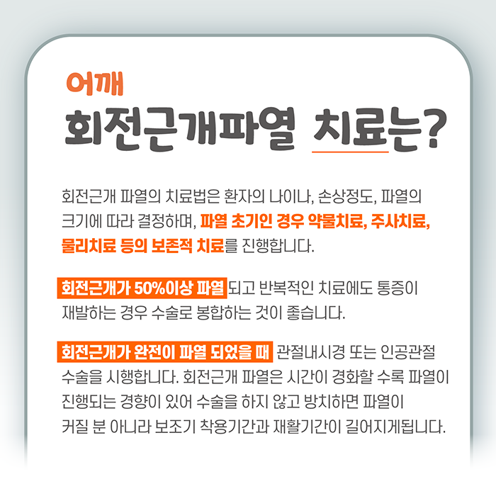 자연스럽게 치유될 때까지 기다리면 1~2년 정도 지속됐을 통증이 오십견 수술을 하면 단기간에 좋아집니다. 그러나 어깨 수술이 끝났다고 해서 바로 앞 어깨 상태로 돌아갈 수 있는 것은 아닙니다. 부드러운 어깨를 위해서는 2~3개월간 재활치료를 받아야 합니다. 오십견 수술 약 하루 동안은 유착이 생기는 것을 막기 위해 보조기를 착용하고 회전근개봉합술까지 함께 진행했다면 수술 부위를 보호하기 위해 2주 정도는 보조기를 착용하는 것이 좋습니다. 파열되어 있던 인대의 범위나 양상에 따라 이는 최대 1~2개월까지 연장될 수 있습니다.